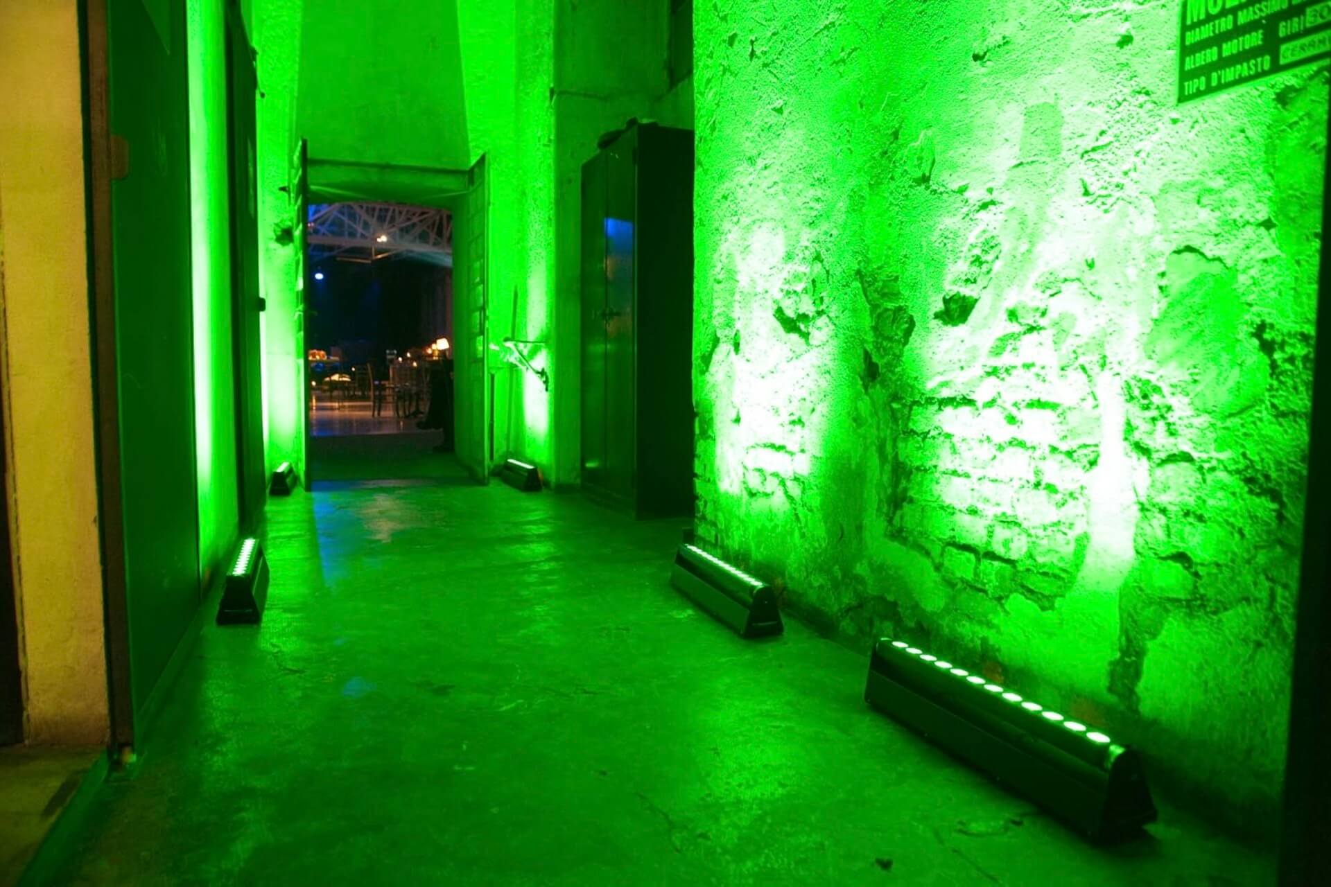 - Suspended party lights and scenic lighting on truss systems, adding movement and visual depth to the live music performance and dance floor