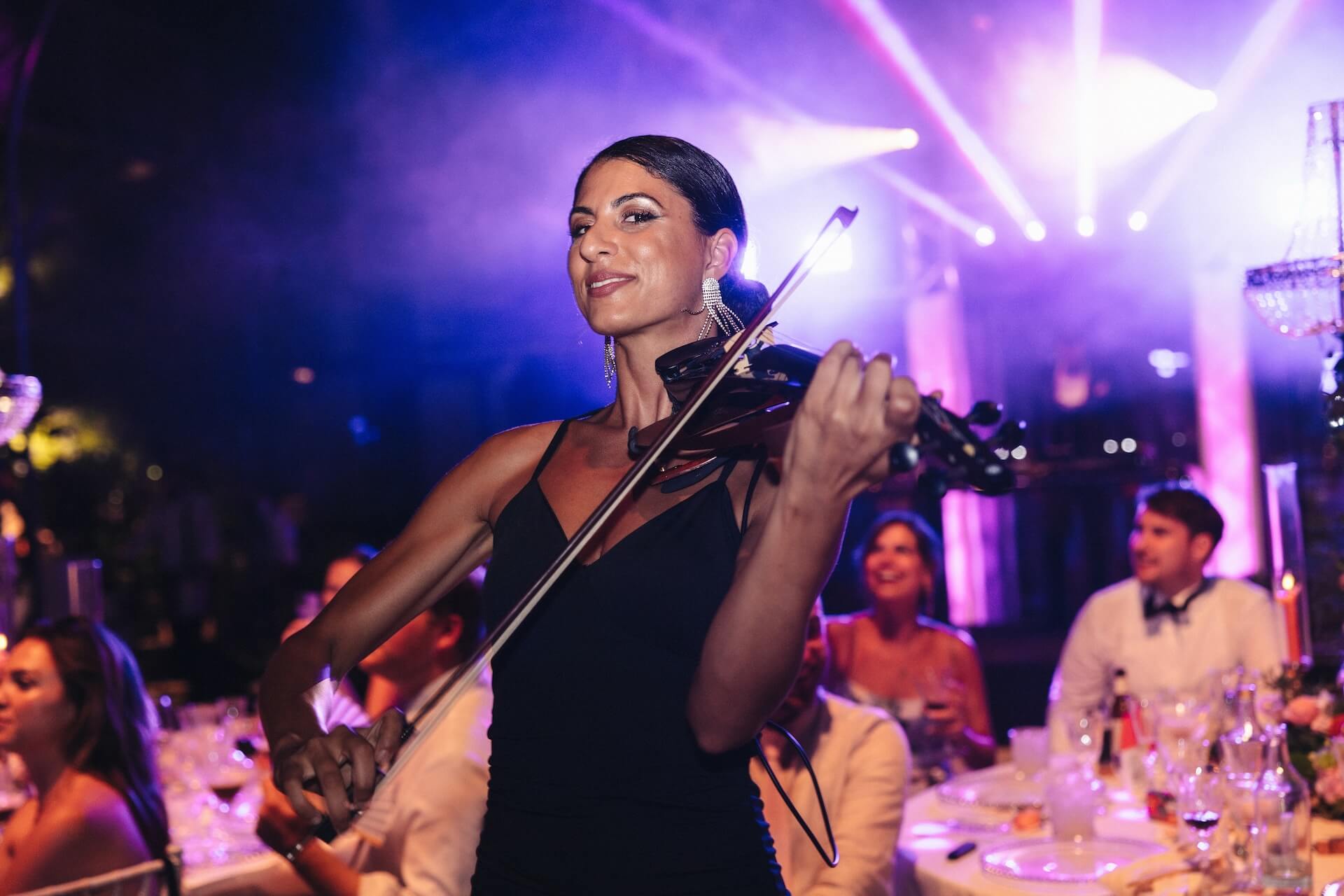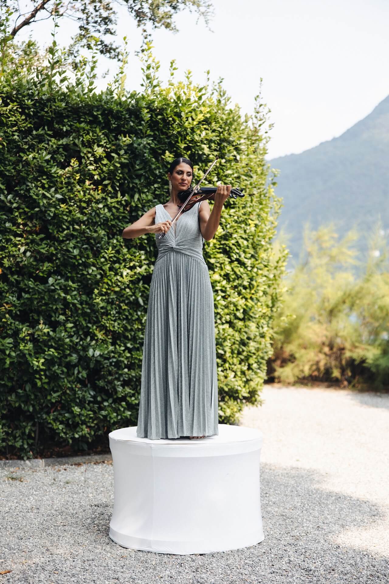 In the villa’s Italian-style garden, guests were welcomed by a luxury string duo performing on round platforms, enriching the aperitif with an elegant repertoire and impeccable aesthetic choices. The violinists, dressed in sophisticated silver gowns, perfectly matched the refined concept of this wedding at Villa Pizzo.